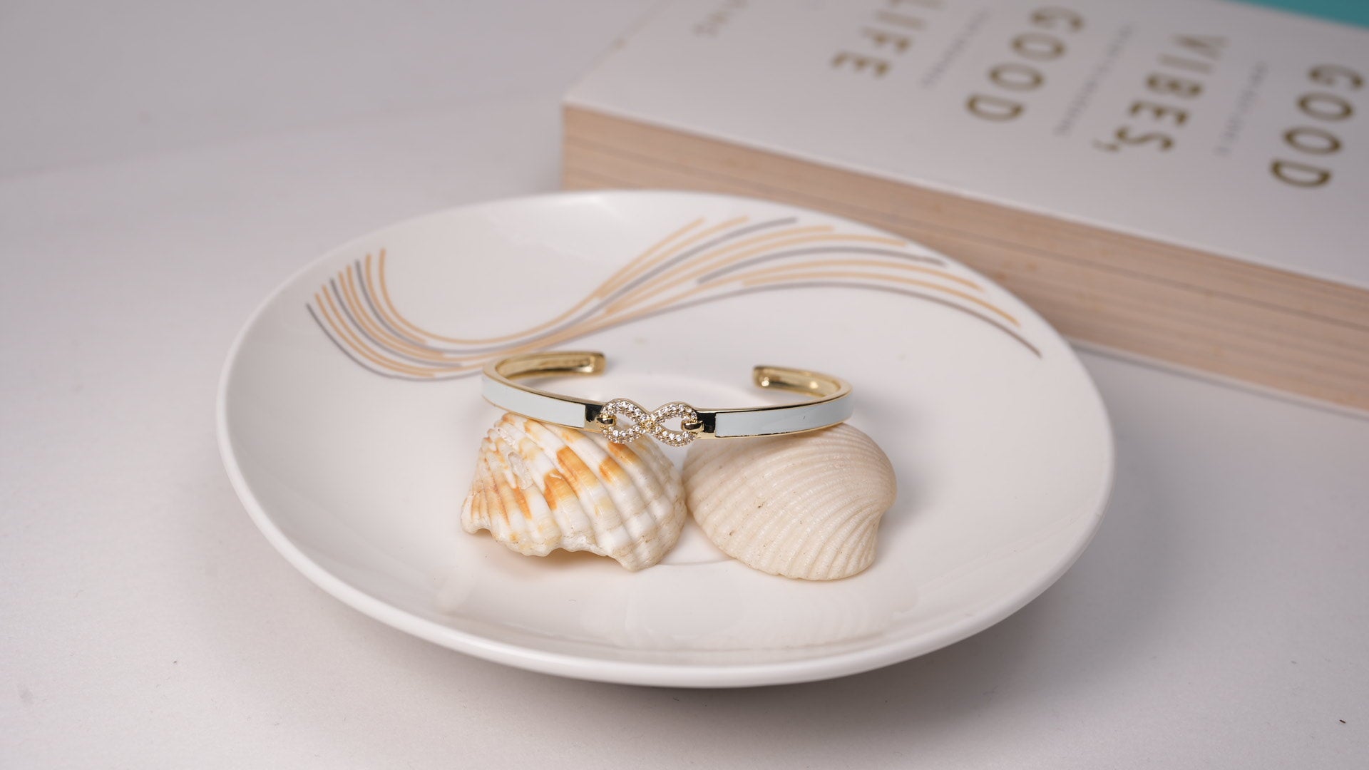 Inspired by the calm and clarity of ocean waters, the Aqua Infinity Bracelet features a sleek infinity symbol that represents eternal bonds. The serene aqua tone brings a refreshing pop of color, making it a perfect blend of elegance and tranquility for everyday wear.