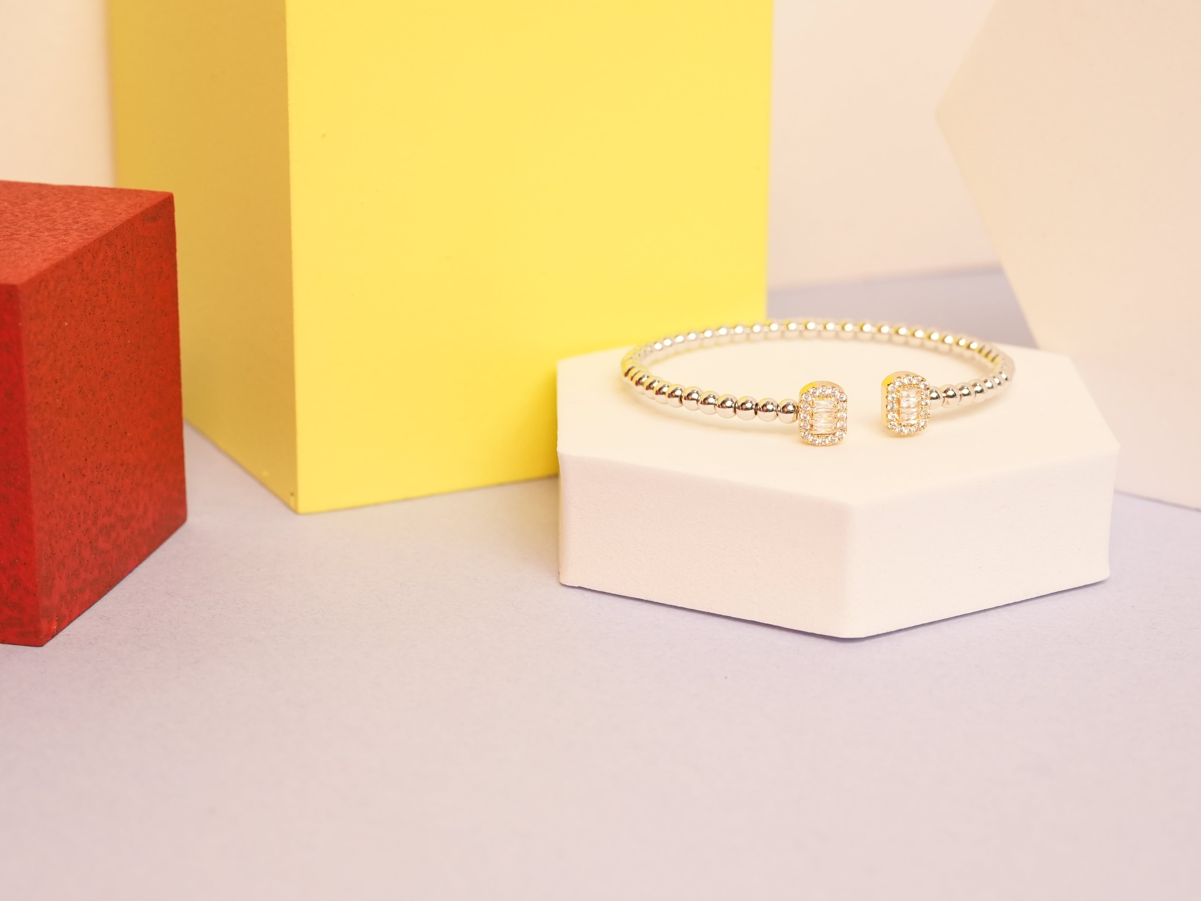 A sleek blend of modern charm and timeless beauty, this cuff showcases a refined silver base accentuated with delicate beaded detailing. The centerpiece is a vivid emerald-hued stone, bringing a rich pop of color against the cool silver tone. Elegant yet versatile, it can be worn solo for a subtle statement or stacked for a bolder look. A perfect accessory to add sophistication and style to any outfit.