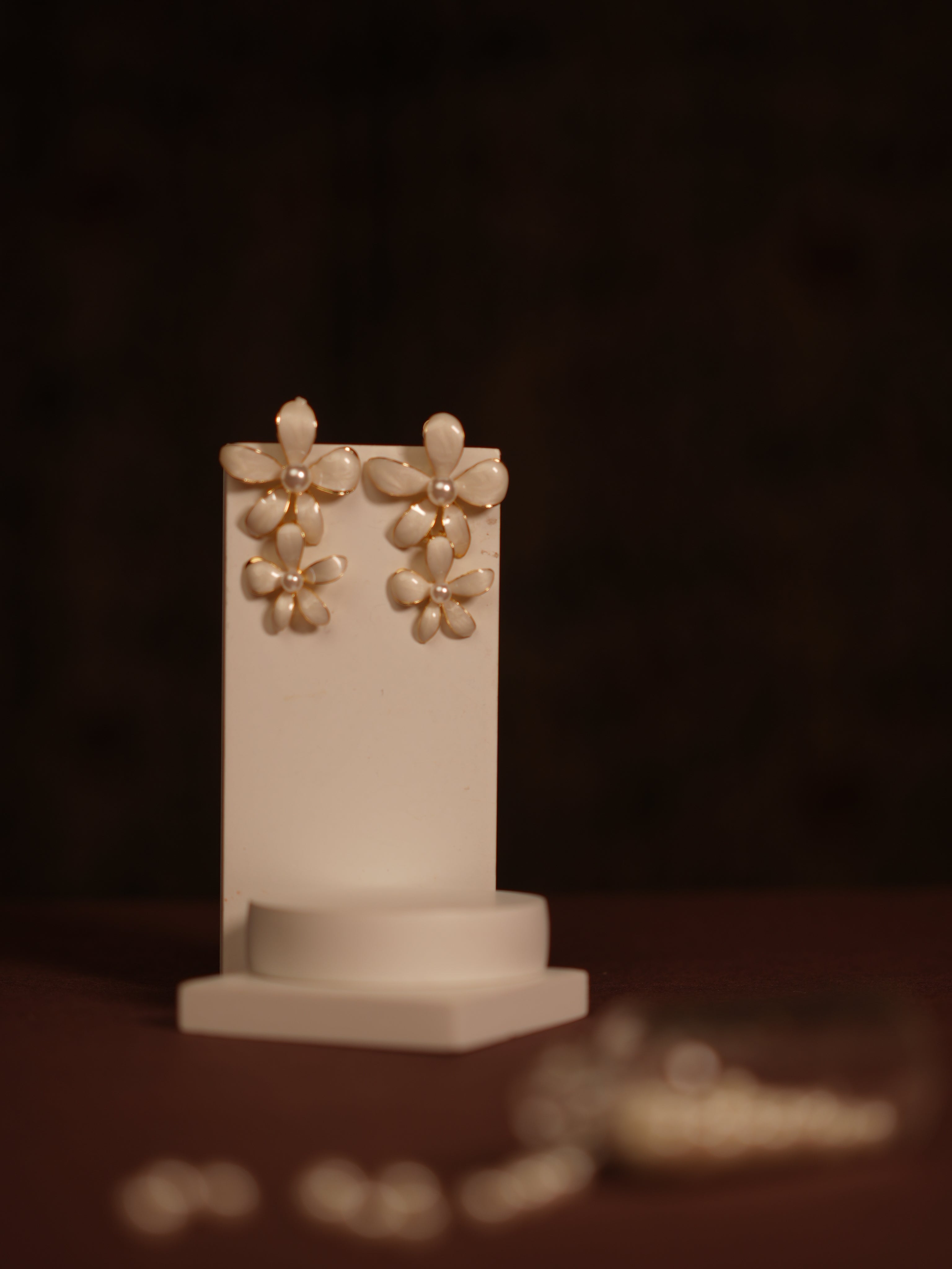 Delicate and feminine, the Blush Bloom Drop showcases a soft floral silhouette in a graceful blush pink hue, cascading into a gentle drop that sways with subtle movement. Accented with a luminous pearl or gold-tone detailing at the center, it captures the essence of understated elegance and blooming beauty. A perfect piece to add a romantic touch to any look.