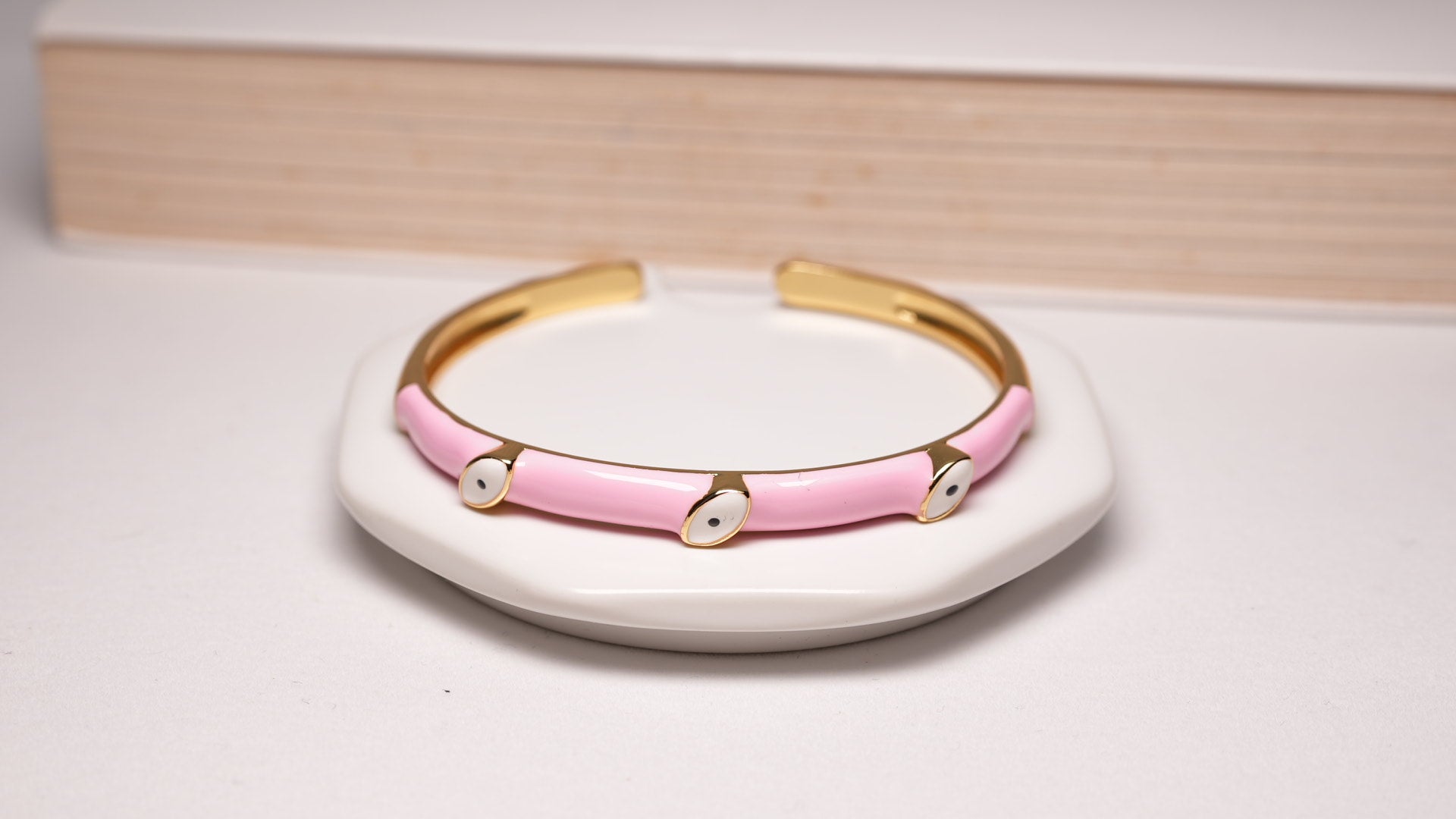 Soft, feminine, and symbolically powerful, the Blush Trinity Evil Eye Cuff is adorned with three blush-toned evil eye motifs along a sleek, open cuff. The gentle blush color adds a delicate, chic touch, while the lightweight design offers comfort and effortless wear. Worn alone or paired with other bracelets, it creates a stylish, layered wrist look. Ideal for everyday styling or special occasions, the Blush Trinity Evil Eye Cuff blends protective charm with modern elegance.