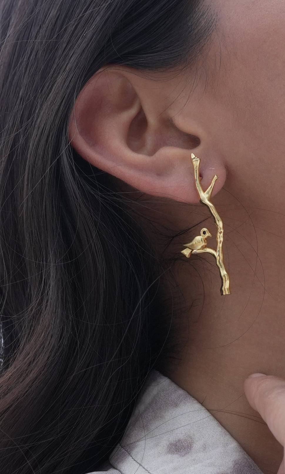 Delicately crafted, the Branch & Bird earrings capture a serene moment in nature — where a slender branch cradles a resting bird in mid-song. Cast in a warm, golden hue, these earrings blend minimalist design with storytelling charm. Lightweight yet bold, they evoke a sense of quiet elegance, perfect for nature lovers and poetic souls alike.