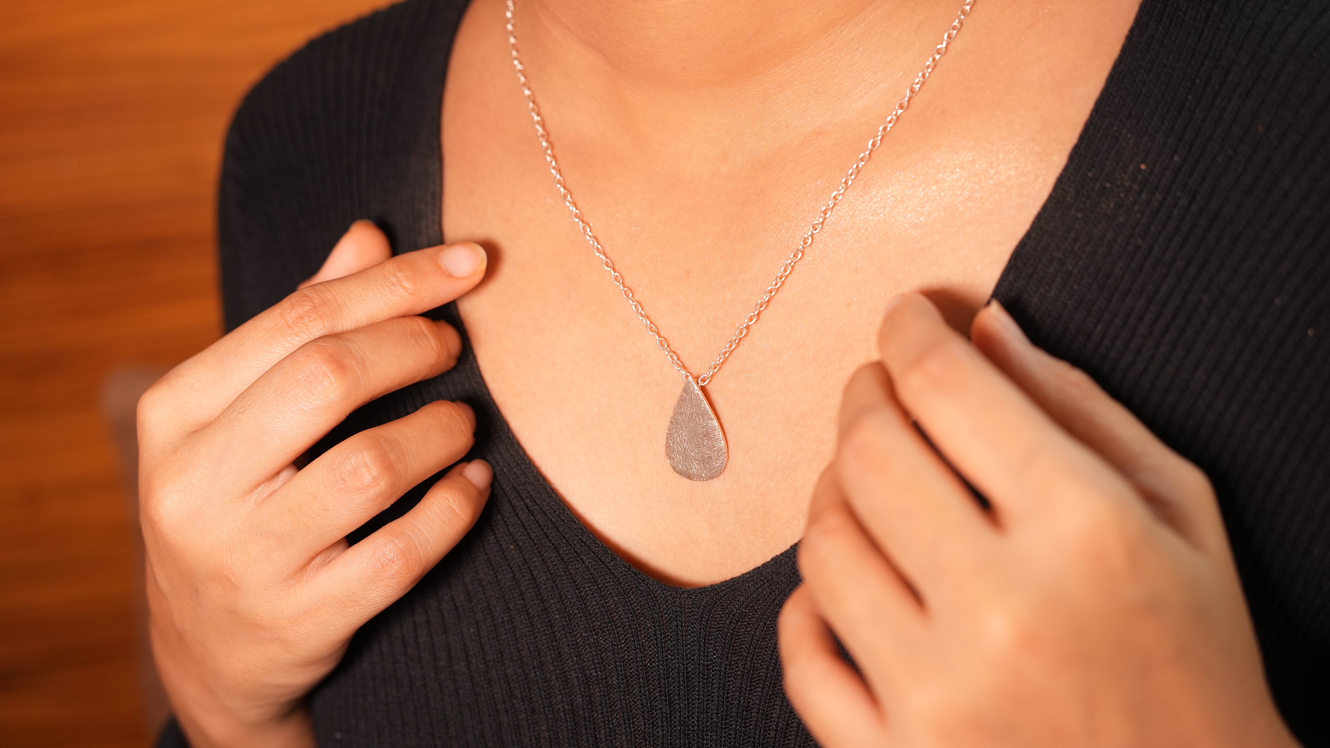 Inspired by the quiet beauty of morning dew, this flat teardrop pendant in rose gold captures elegance in its simplest form. With its soft curves and polished finish, it evokes a sense of calm, clarity, and gentle strength. A versatile piece that brings a touch of natural grace to any outfit.