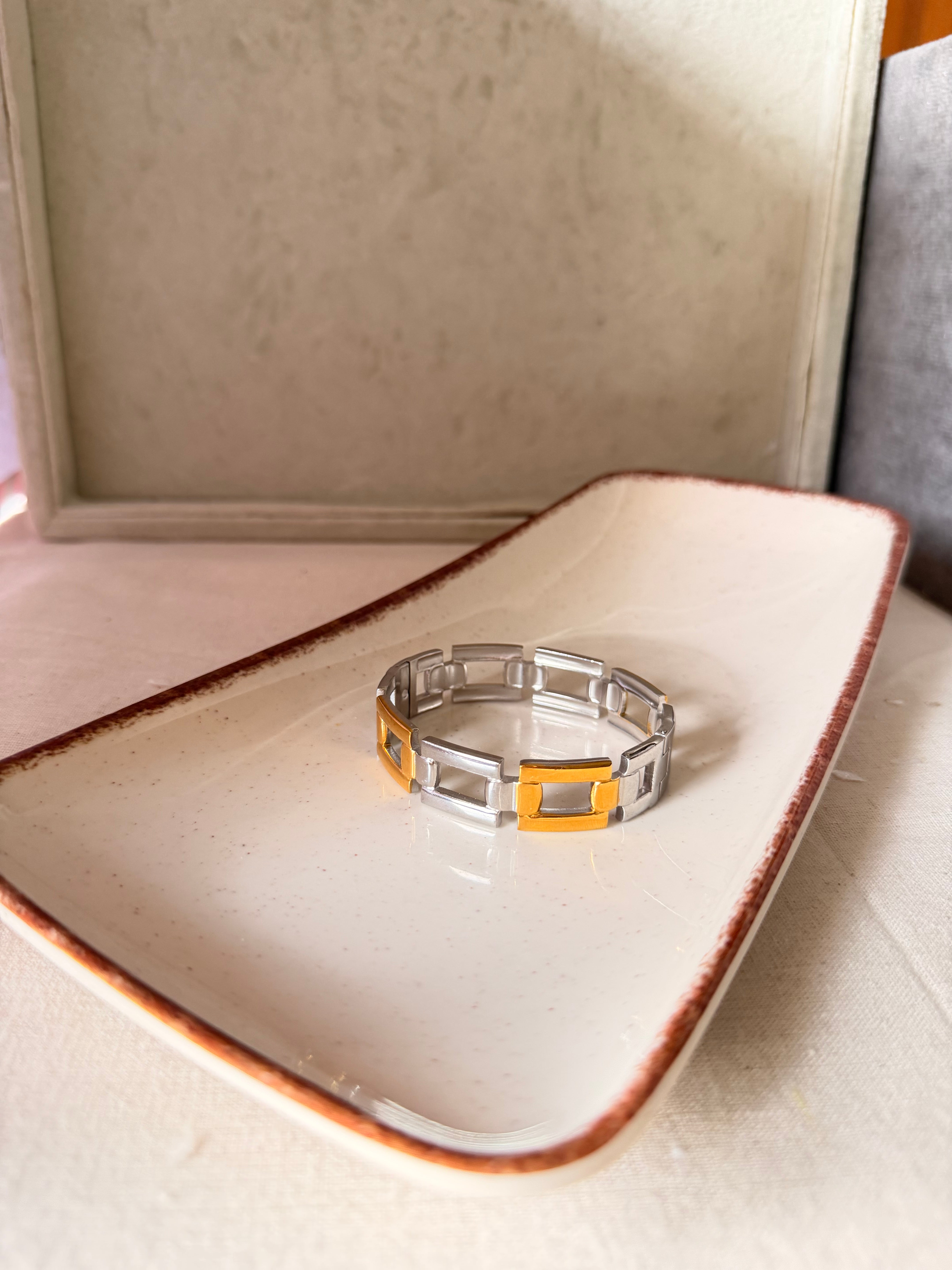 Bold and contemporary, the Dual Armor Cuff features a sleek, structured design inspired by modern armor. With its dual-tone metal finish and sculpted symmetry, this cuff blends strength with sophistication. A statement piece that commands attention, it’s perfect for adding an edge of power and polish to any outfit.