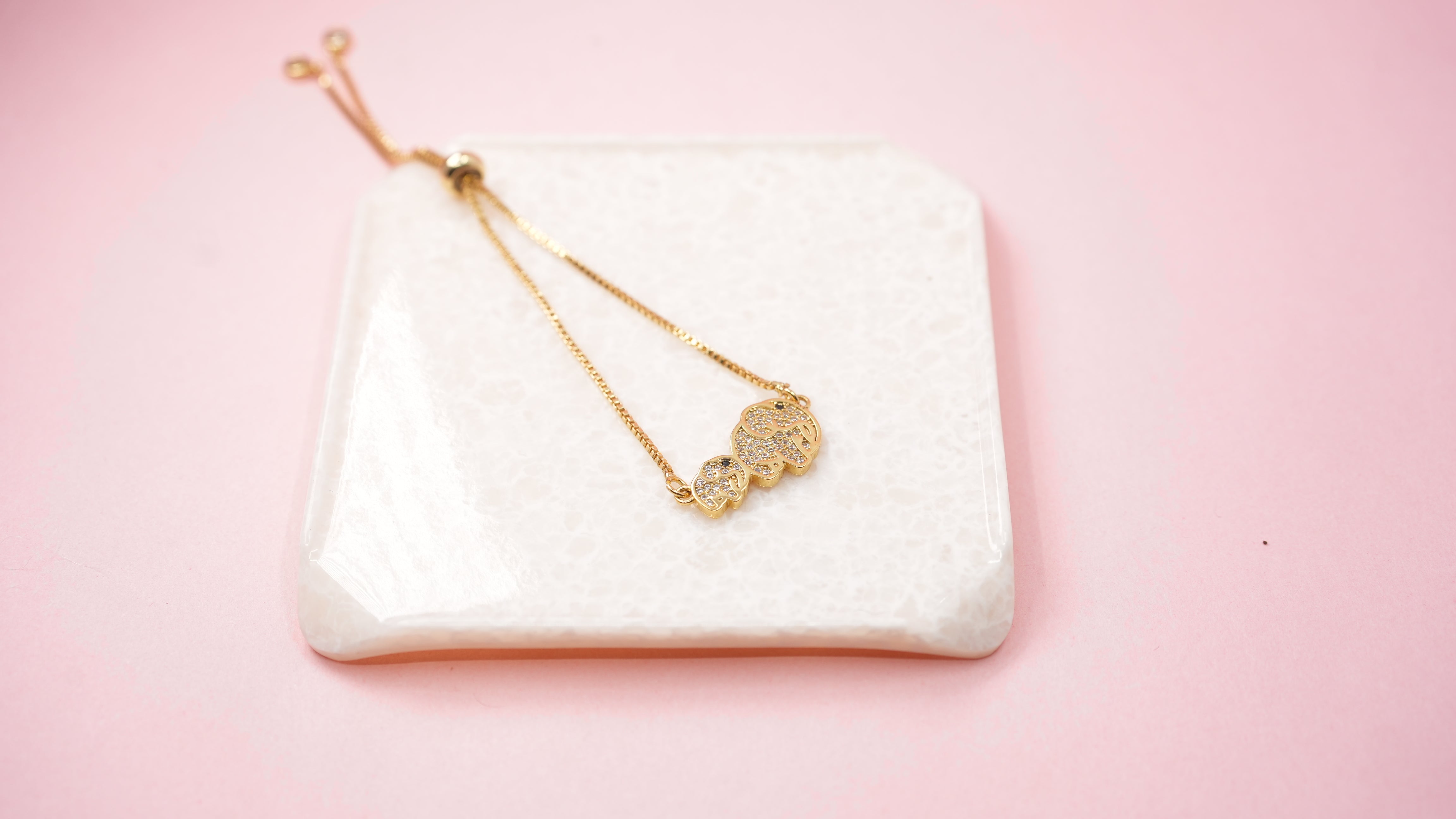 “A sleek golden charm featuring two elephants side by side — a symbol of togetherness and power. Clean lines and a polished finish give it a contemporary, timeless feel.”