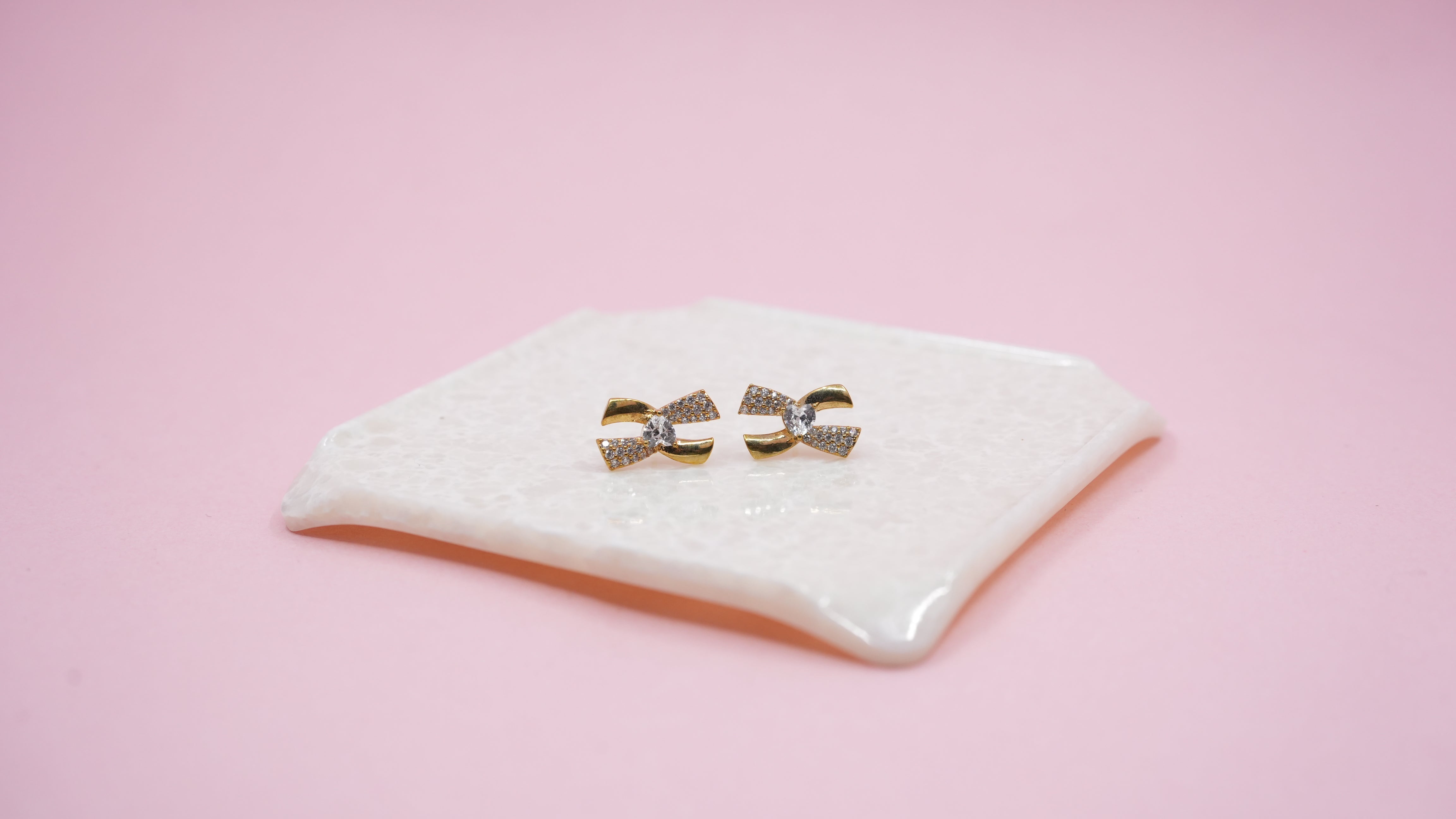The golden bow features a soft, ribbon-like silhouette crafted in polished or brushed gold, symbolizing elegance, femininity, and a touch of glamour.