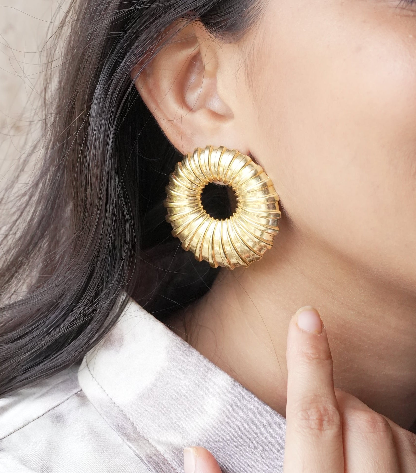 Bold yet playful, the Golden Donut earrings are a modern twist on timeless elegance. Featuring a smooth, circular silhouette with a hollow center, these statement pieces are crafted in a radiant gold finish that catches the light with every turn. Lightweight and versatile, they bring a polished edge to both casual and elevated looks.