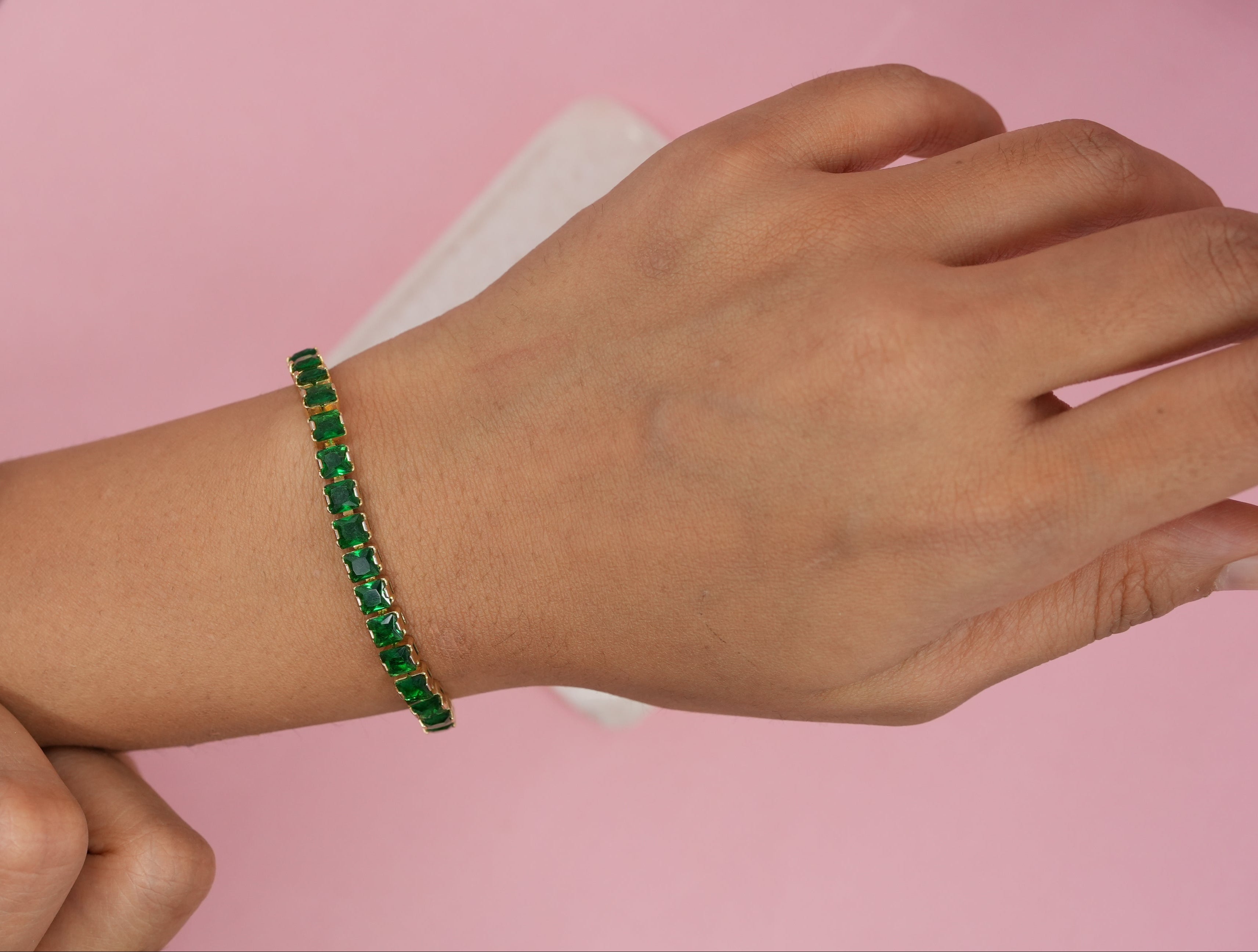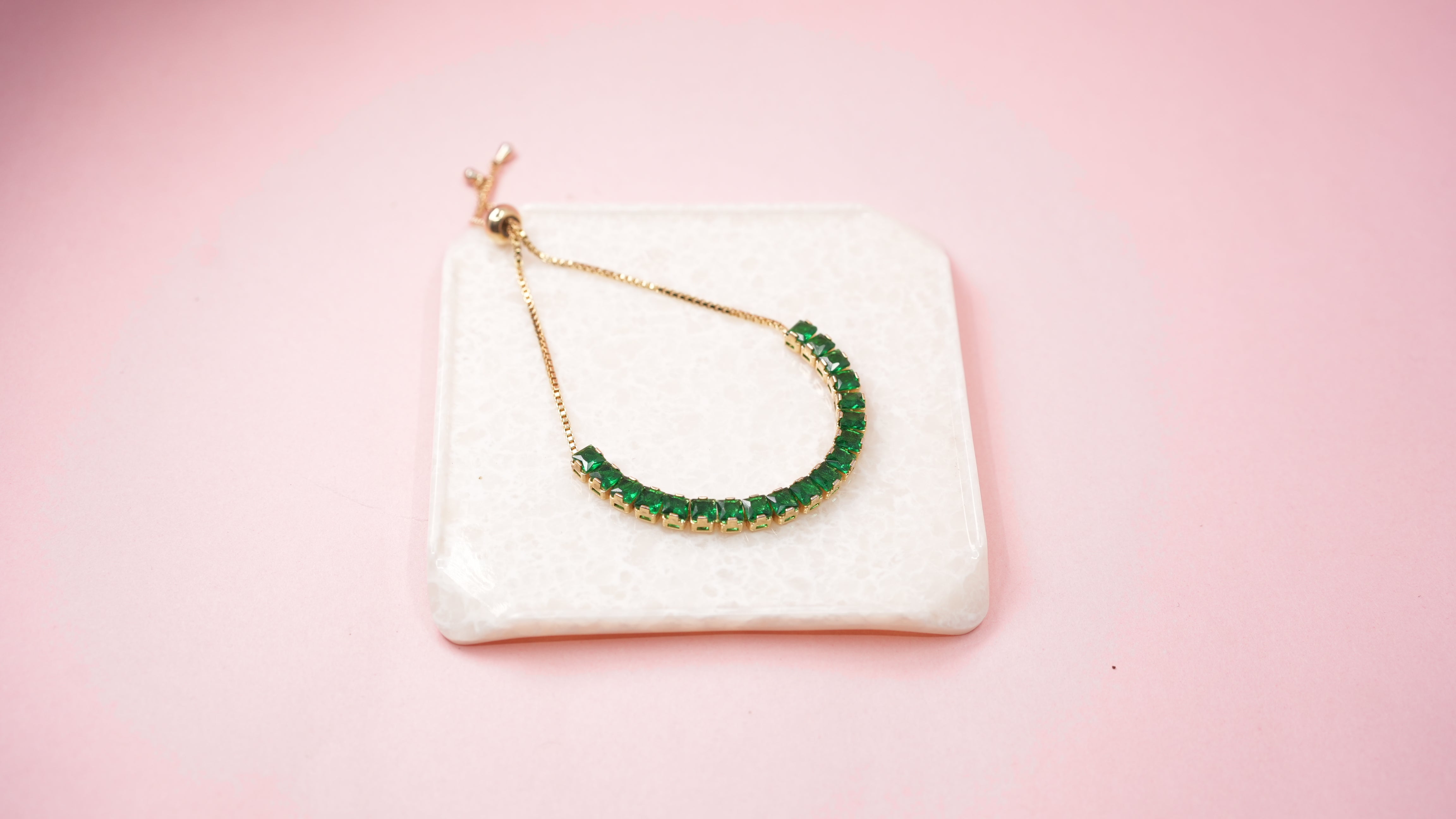 “The Jade Trail Golden design blends the richness of gold with the serene beauty of jade. A graceful path of green stones flows through a golden setting, symbolizing harmony, balance, and timeless elegance.”