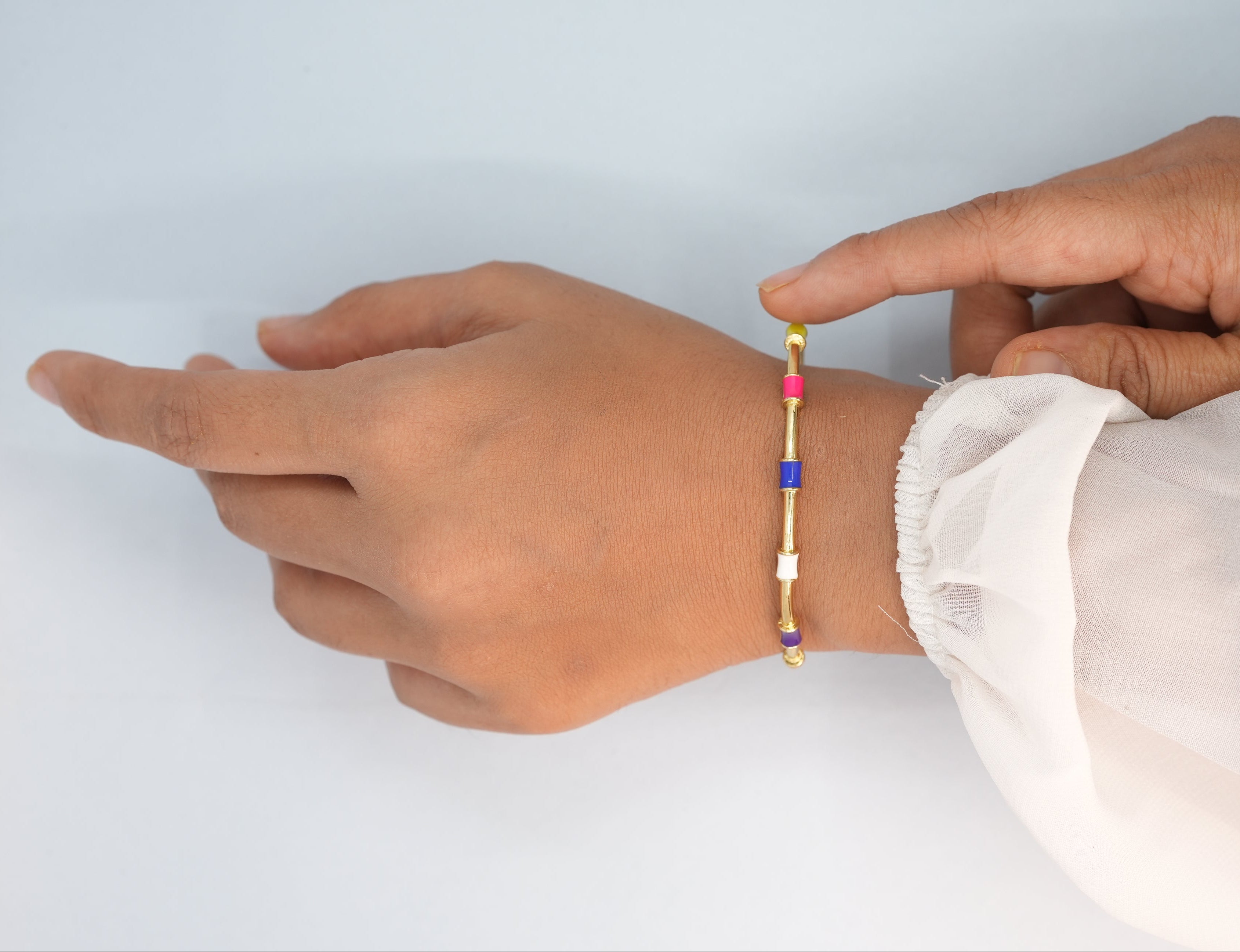 A Mini Dot Multi Cuff is a vibrant and playful twist on the classic mini dot pattern, where the base color might be a neutral or solid shade (like white, black, or navy), and the dots themselves come in a range of colors. These colors could include combinations of bright hues like red, blue, yellow, green, or even pastels, creating a lively and dynamic effect that adds excitement to any outfit.