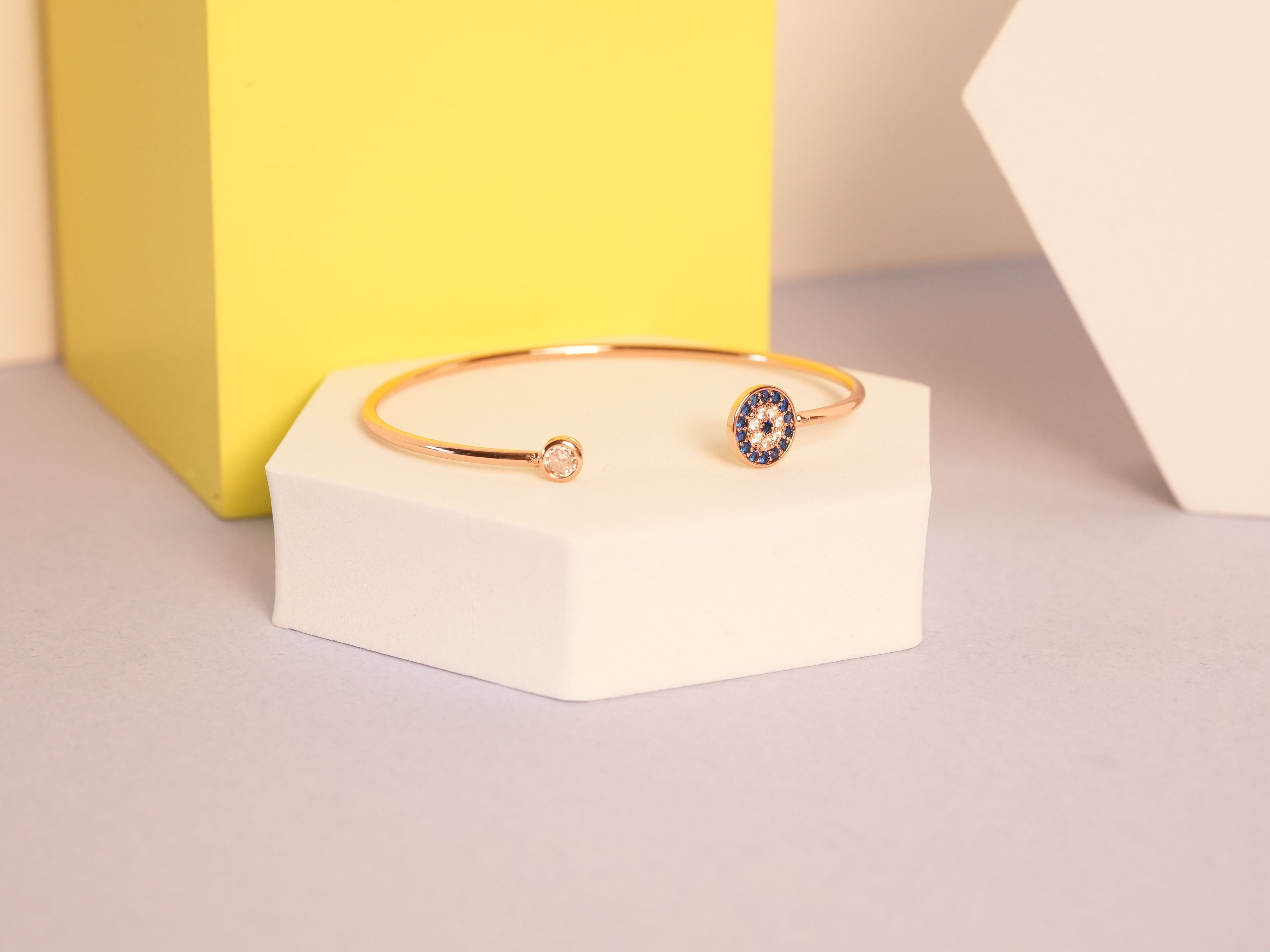 A captivating design where the serene beauty of the ocean meets the elegance of rose gold. The soft blush tones embrace a glimmering centerpiece, resembling a protective eye that symbolizes clarity, intuition, and timeless charm. A perfect blend of meaning and modern style.