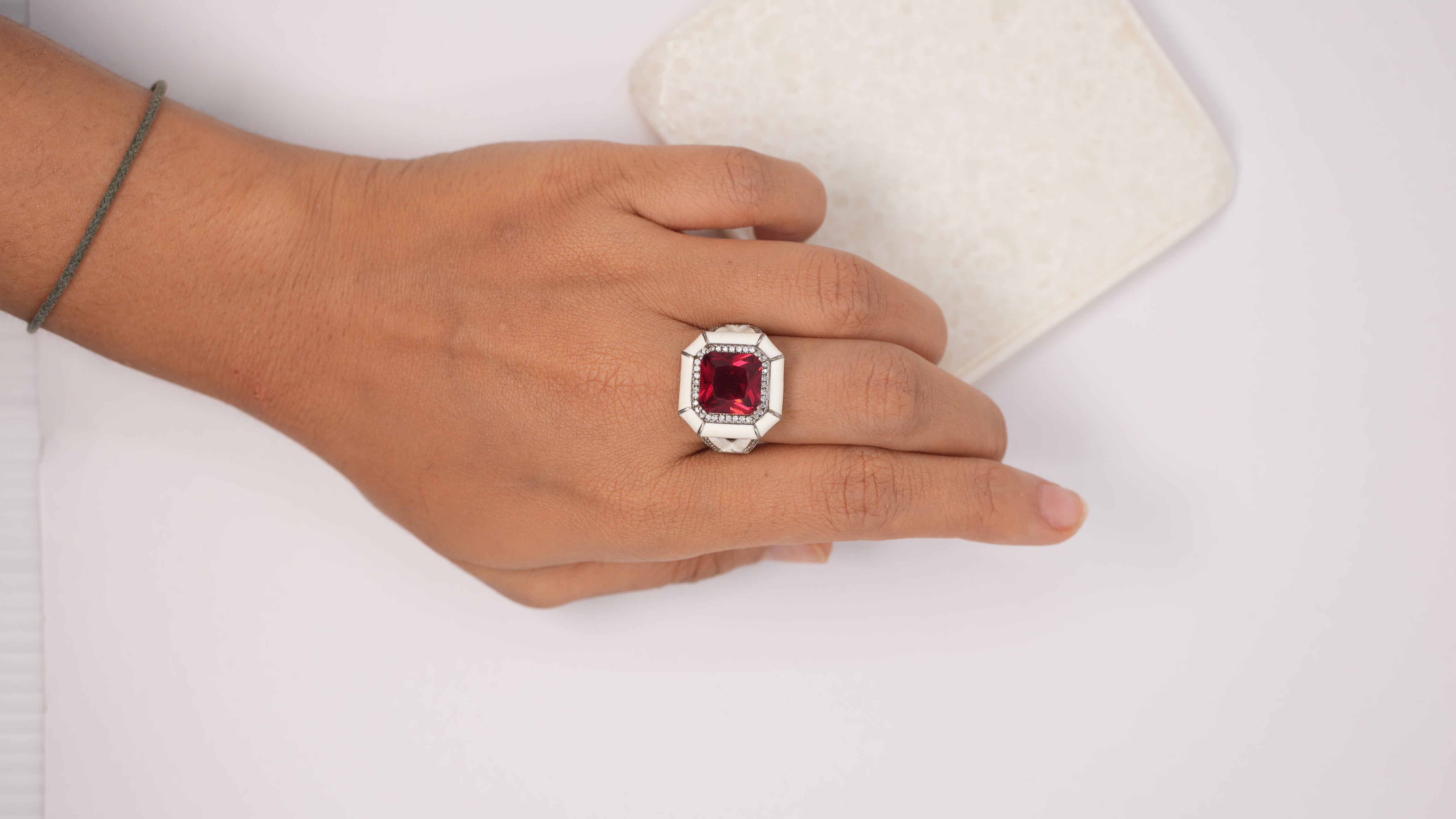 "Where fire meets ice. ❄️❤️ Shine bold with the Scarlet Frost Ring."