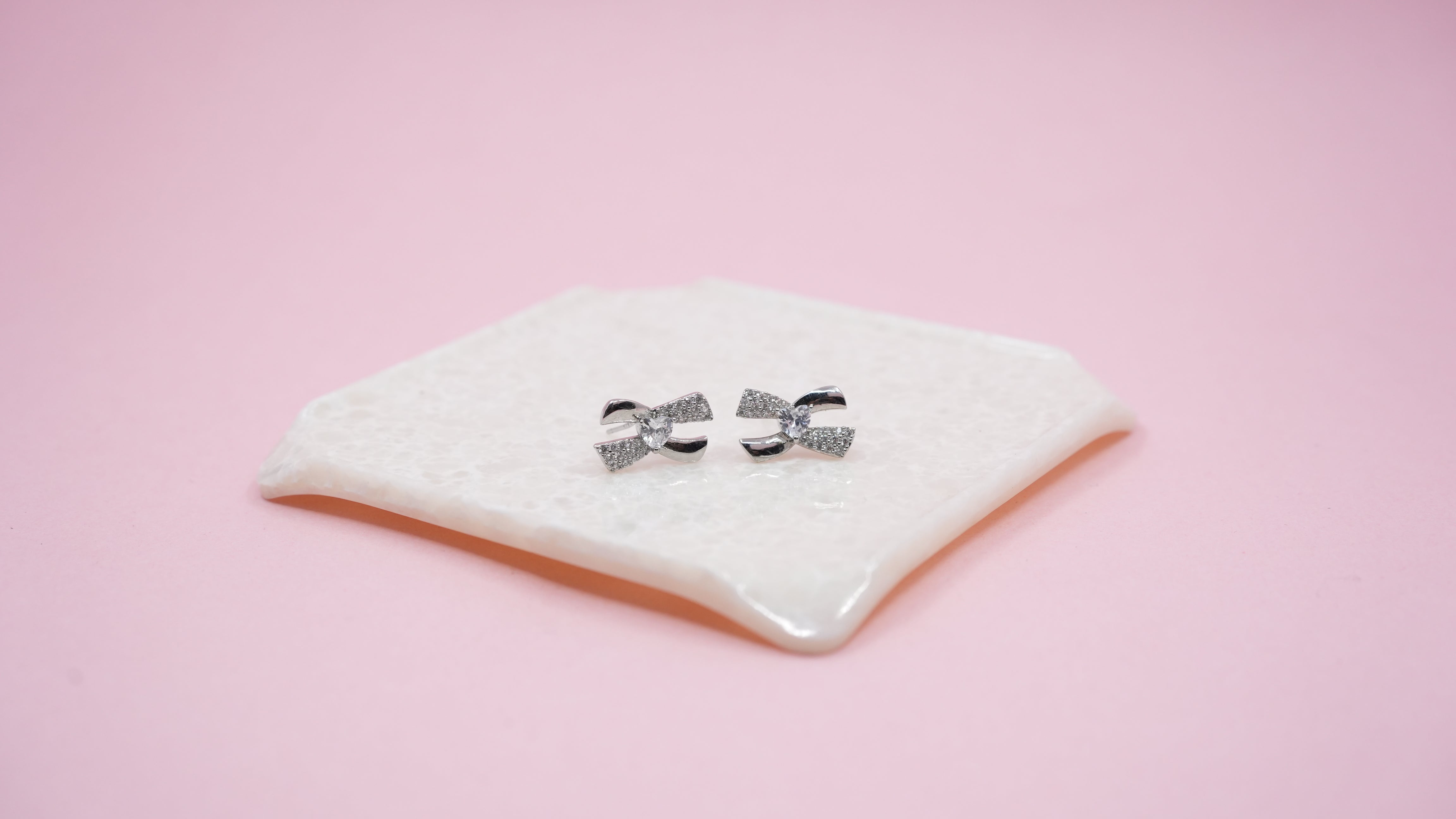 The silver bow features a gracefully tied ribbon design, crafted in shiny or matte silver, symbolizing femininity, elegance, and timeless charm.