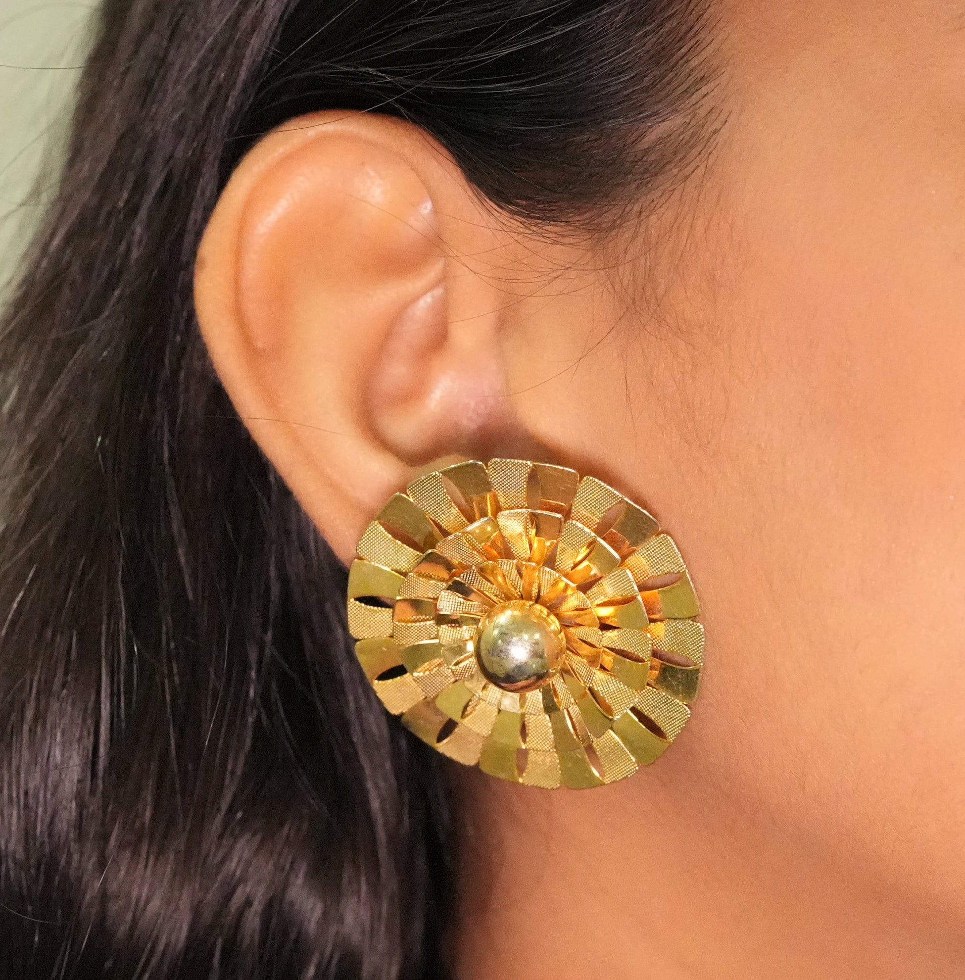 Radiating joy and warmth, these earrings capture the vibrant essence of a sunflower in full bloom. Crafted in gleaming gold with intricate petal textures, they create a bold yet elegant statement. The circular floral silhouette symbolizes positivity and light, making them the perfect accessory to brighten both everyday looks and special occasions with effortless charm.
