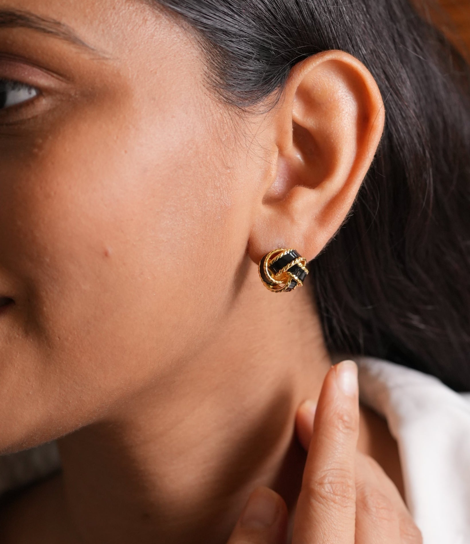 The rich black hue brings a sense of sophistication and edge, while the twisted knot creates a sculptural, dynamic effect.
